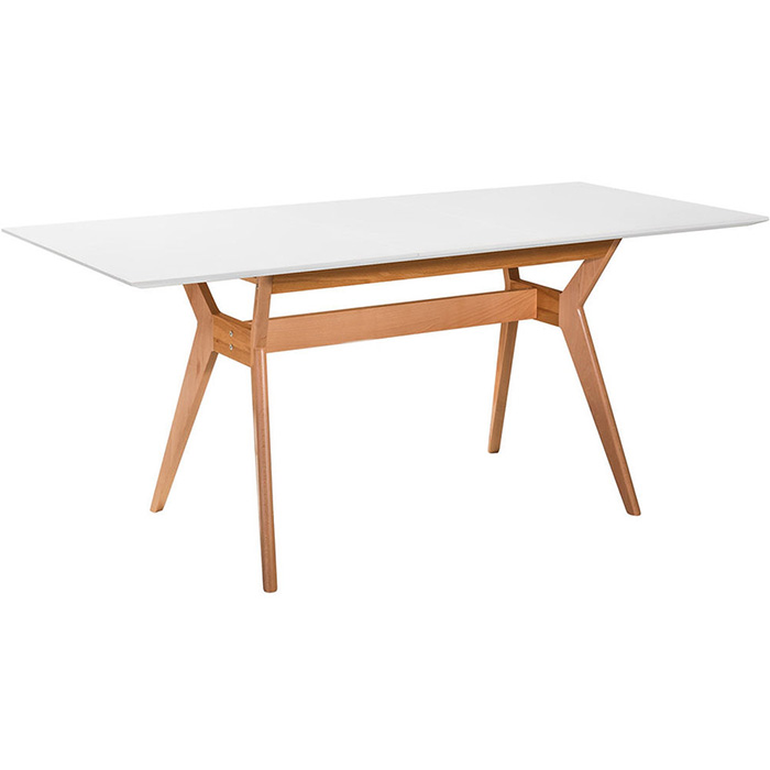 Прямоугольная форма визуально делает интерьер более уютным. Стол особенно подойдет под современные стили контемпорари и хай-тек. Опоры из натурального дерева хорошо сочетаются со светлыми поверхностями и каменным рисунком на ламинате или плитке.